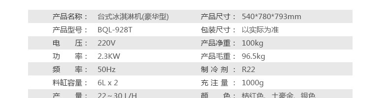 BQL-928T臺(tái)式冰淇淋機(jī),1.選用國(guó)際牌壓縮機(jī),輔以旭眾精湛工藝,大大縮短冰淇淋成型時(shí)間,高效節(jié)能;2.全新液晶智能觸控面板,簡(jiǎn)單明了,多功能易操作;3.全新升級(jí)專業(yè)膨化泵,膨化率高,產(chǎn)量增加30%;4.一鍵清洗功能,省時(shí)方便;5.主要部件采用不銹鋼材質(zhì),時(shí)尚美觀,持久耐用;6.先進(jìn)的機(jī)械攪拌系統(tǒng),機(jī)器運(yùn)行穩(wěn)定可靠,低噪音,產(chǎn)品口感爽滑細(xì)嫩。