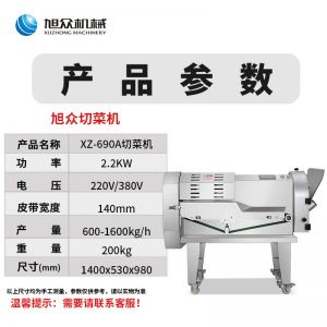 XZ-690A型多功能切菜機(jī),工作效率高,幫你省人工費(fèi)。1小時(shí)可切600kg-1600kg/h,1臺(tái)機(jī)器等于多名廚師同時(shí)為您工作。一機(jī)多用,可切瓜果、蔬菜、藥材,刀片可進(jìn)行更換,設(shè)計(jì)周到,結(jié)構(gòu)合理,簡單輕松應(yīng)對。