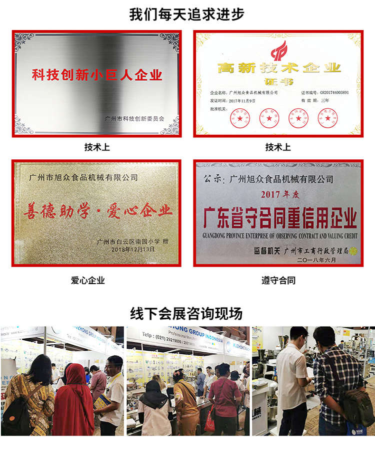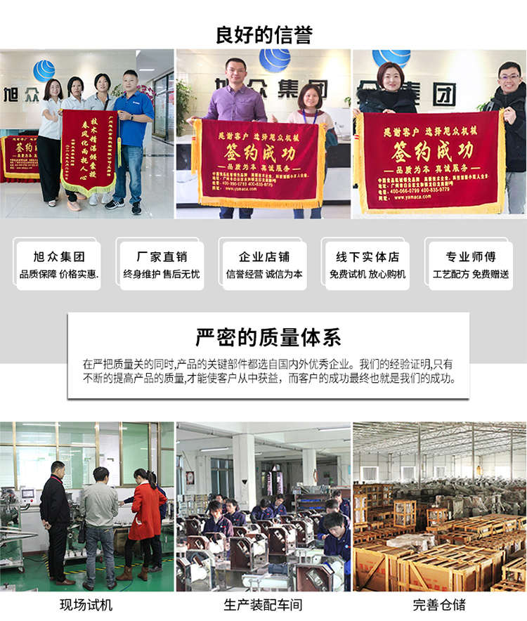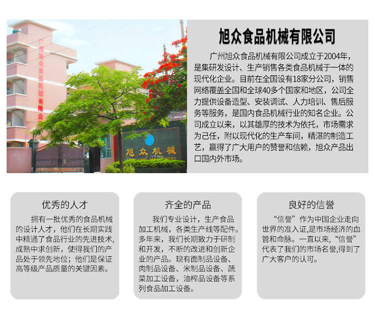 廣州旭眾食品機(jī)械有限公司是一家集科研開發(fā),生產(chǎn)設(shè)計(jì),營銷服務(wù)為一體的現(xiàn)代化生產(chǎn)企業(yè)。現(xiàn)代化生產(chǎn)車間,精湛制造技術(shù),所產(chǎn)機(jī)械歷經(jīng)市場重重考驗(yàn),不斷贏得海內(nèi)外客戶的贊譽(yù)。