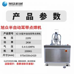 名稱XZ-30型半自動耳帶點焊機 電源220v 功率2kw 產(chǎn)量詳情咨詢13113134411 微信13113134411蔣經(jīng)理 尺寸970*530*1420MM 重量200kg 規(guī)格頻率50HZ 其他氣壓0.4-0.6mpa