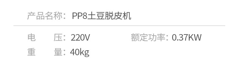 名稱PP8、PP15薯仔脫皮機 電源220v 功率0.37kw/0.75kw 產(chǎn)量8千克/次 / 15千克/次 尺寸480*480*780mm/500*500*860mm 重量52kg/66kg 規(guī)格 其他